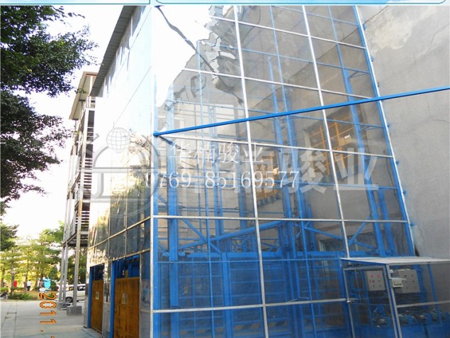 室外双货梯并行安装。双梯共用整体外围,PC板封边,内部彩蓝色框架,黄色配重门,货