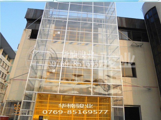 透明PC板外围,3支、两组、两级接力式油缸顶升;1.5*1.5*2的中小型轿厢,承重1吨,